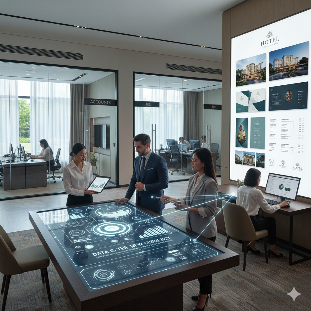 Data is the new currency of strategic decision-making in hospitality. We implement advanced Management Information Systems that transform raw data into actionable information, giving real-time visibility into your operations, guest activities, and business performance. Our MIS solutions transform information into your greatest strategic asset. We also support design of office areas for Accounts, HRD, and other departments, along with graphic requirements including brochures, menu cards, and branding elements to align with the hotel’s concept.
